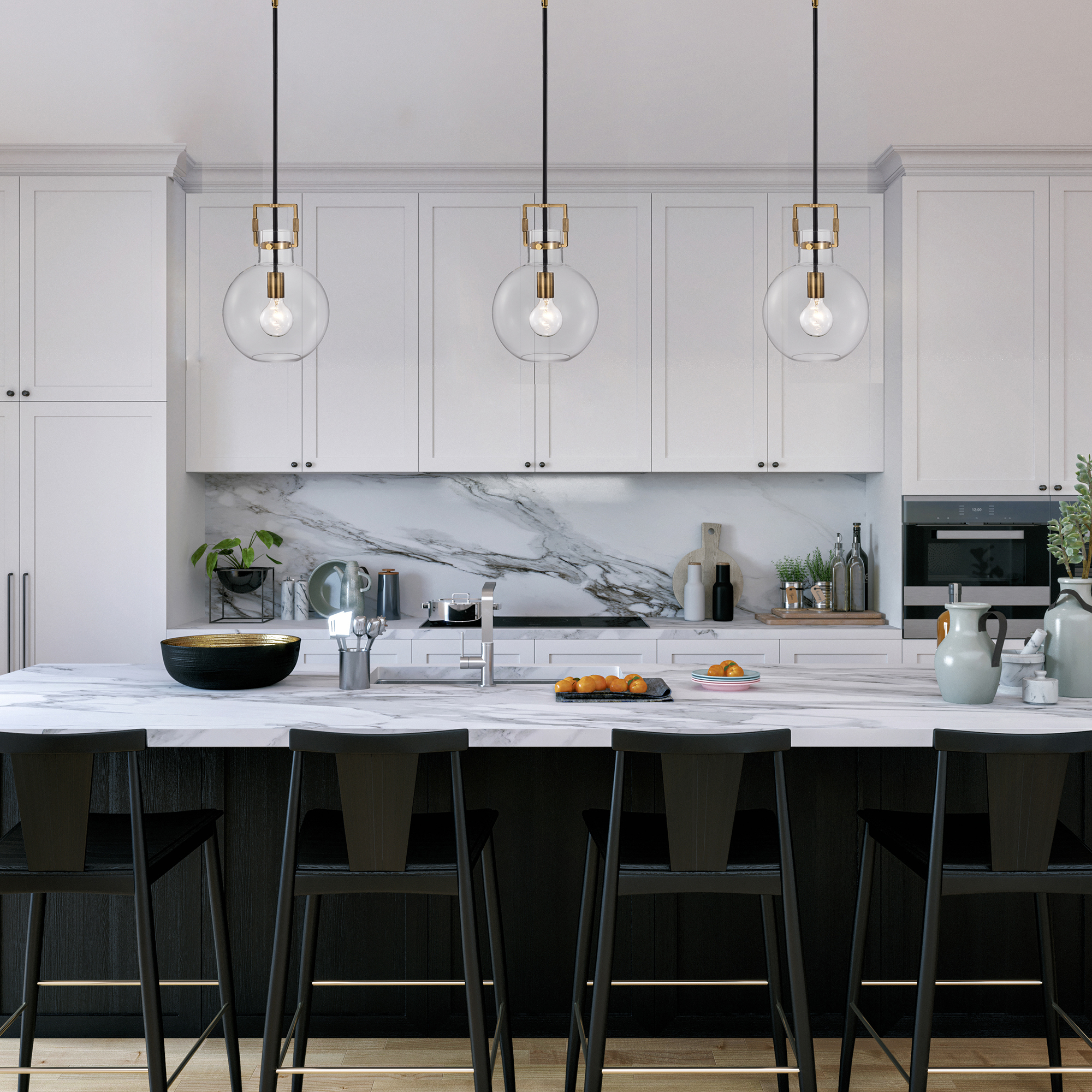 This one-light pendant combines clear glass and gold elements to create a stunning yet minimalist design. Featuring a globe shaped glass shade, this fixture provides ample illumination to all your favorite spaces while fitting into many of today’s design trends. This pendant is ideal overhead any kitchen island or dining room.