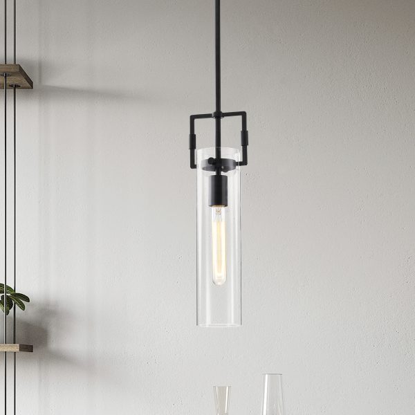 Elevate your home with our modern lighting essential, the 1-Light cylindrical shade pendant. This contemporary pendant light features a clear glass cylinder shade and a black finish that works well with a variety of interiors. Give your kitchen island, dining table, or breakfast bar an upgrade by placing multiples of this pendant light overhead. This black pendant light takes one max 100-watt E26 bulb (not included). We recommend using a T10 bulb shape to complement the cylinder shape. Use one or all of the three 12 inch and one 6 inch rod that are included to create a custom hanging height.