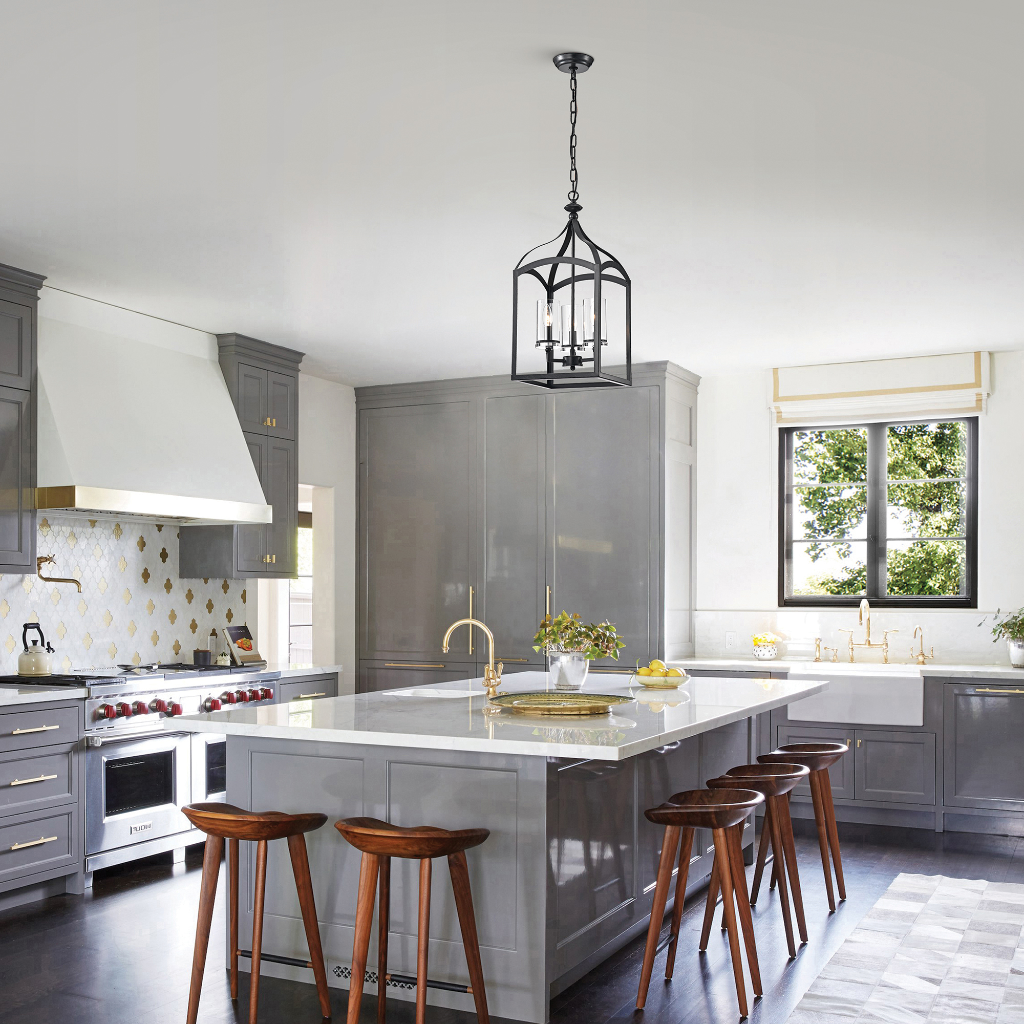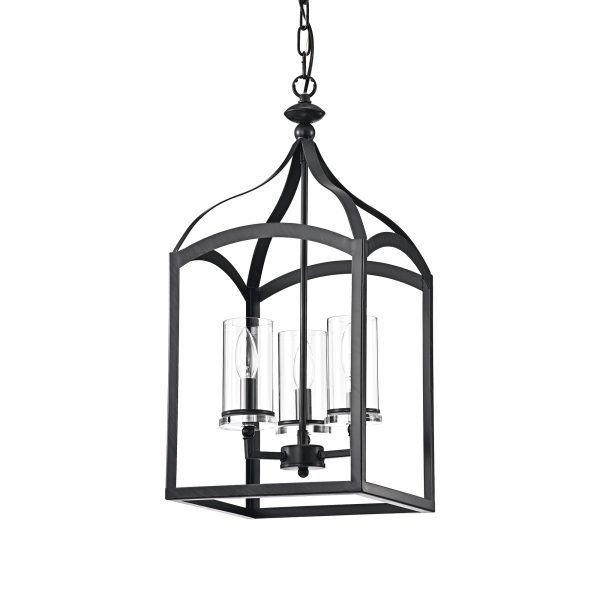 This modern farmhouse style lantern chandelier invokes reminders of an old English castle. Featuring three candelabra style lights with clear glass cylindrical sconces for plenty of light coverage. With a 40 inch adjustable chain and a black finish, it creates drama and is sure to be a conversation starter. Measuring 11 inches wide x 11 inches deep x 23.6 inches high, a perfect size for any room you put it in.