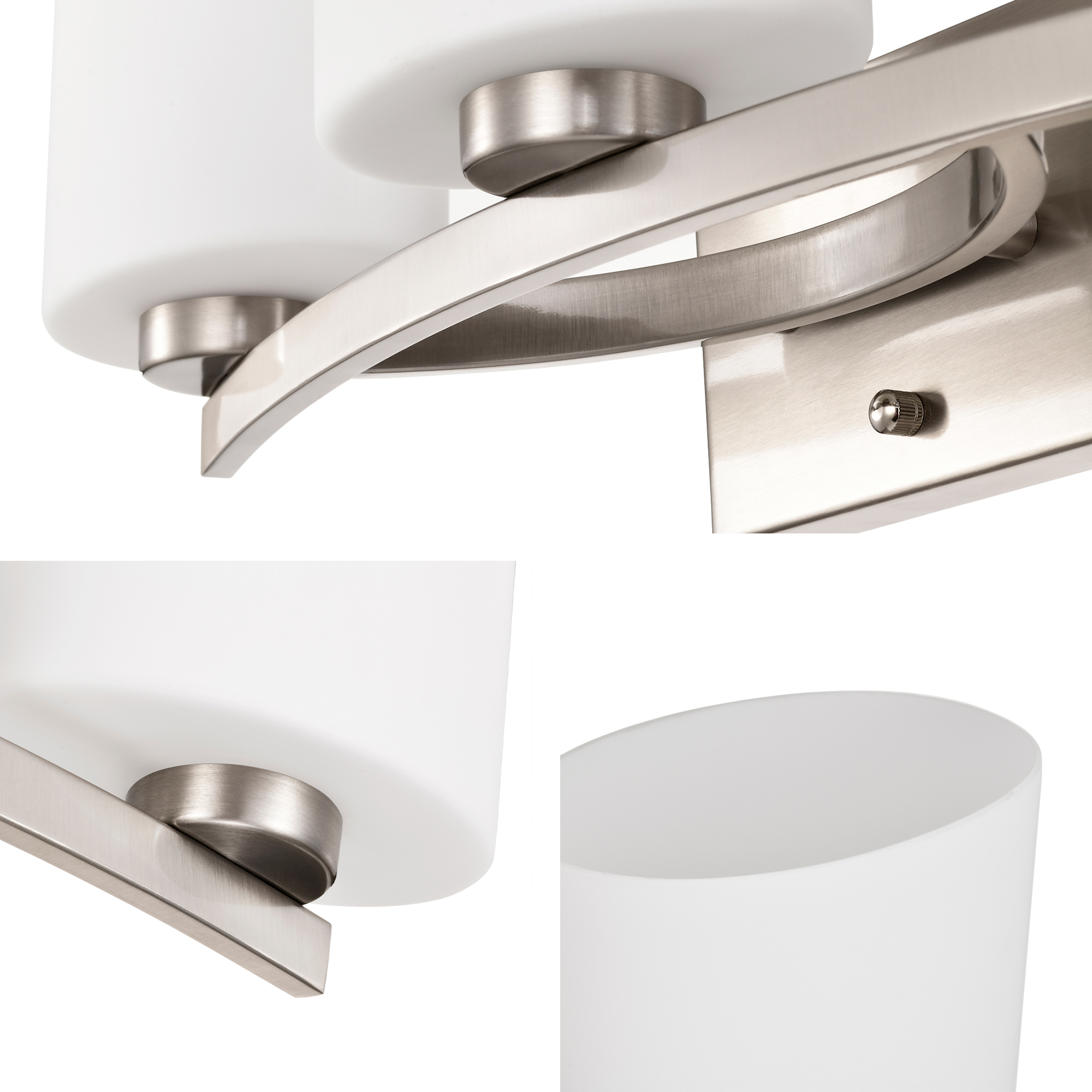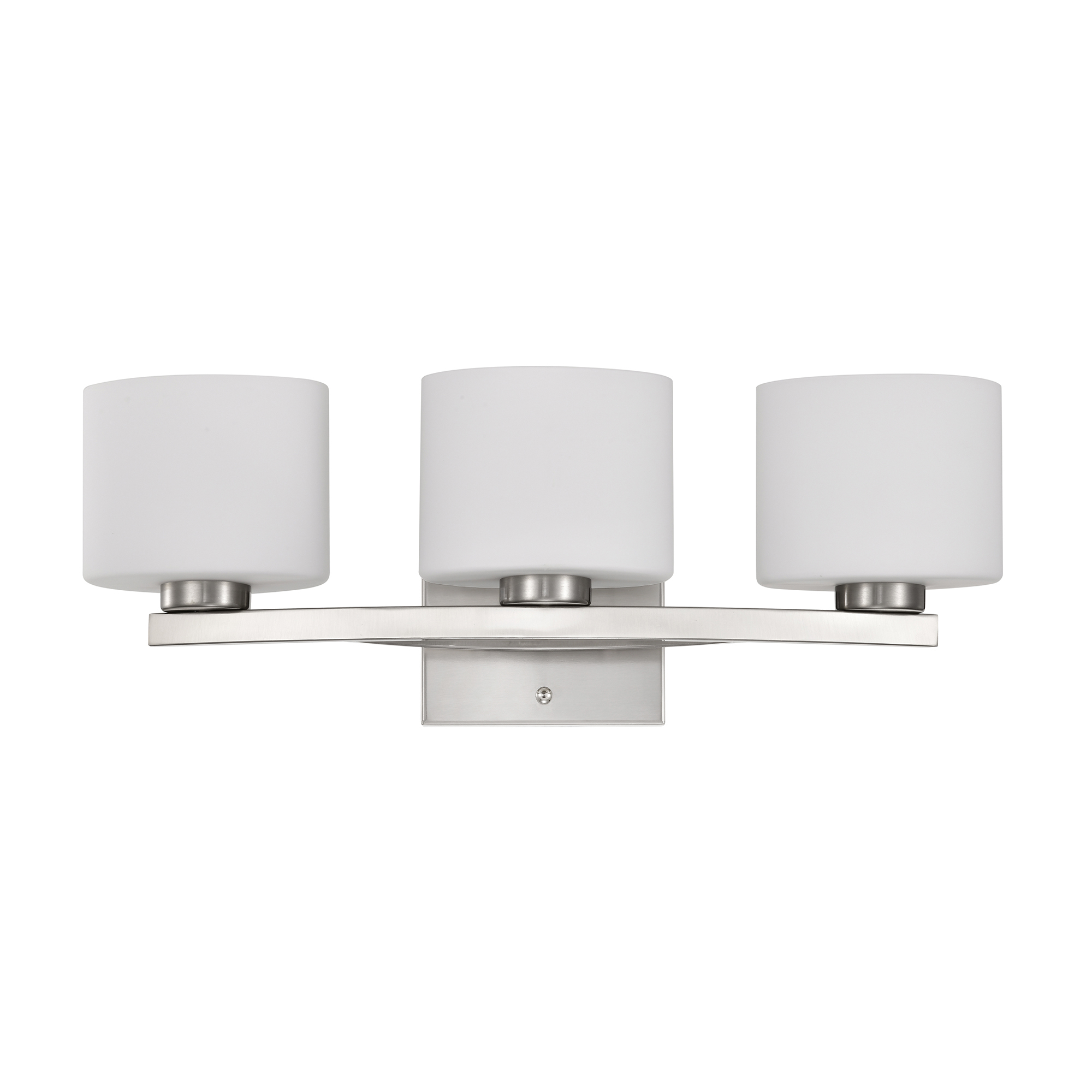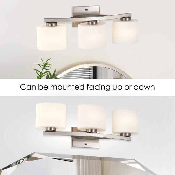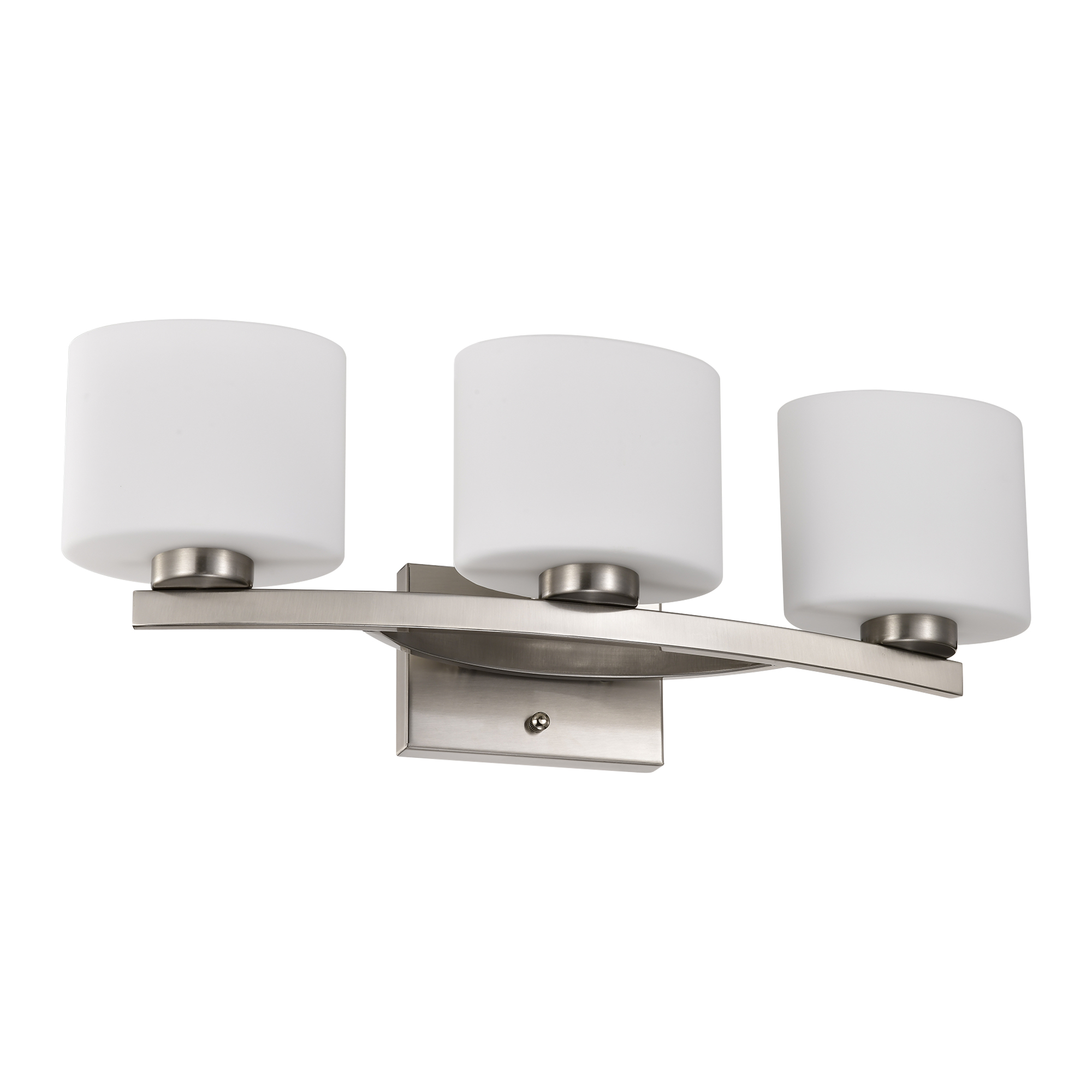 This three-light vanity adds a classic, yet modern approach to your interior décor. Featuring a curved base, the three oval shaped white glass shades diffuse light subtly to provide the perfect amount of illumination to your bathroom vanity area. The brushed nickel finish is a timeless option that is sure to grace the bathroom, bedroom, or over mirrors as a wall-mounted light. This modern vanity light is also dimmable when used with a dimmer switch and dimmable bulbs for added customization and versatility.