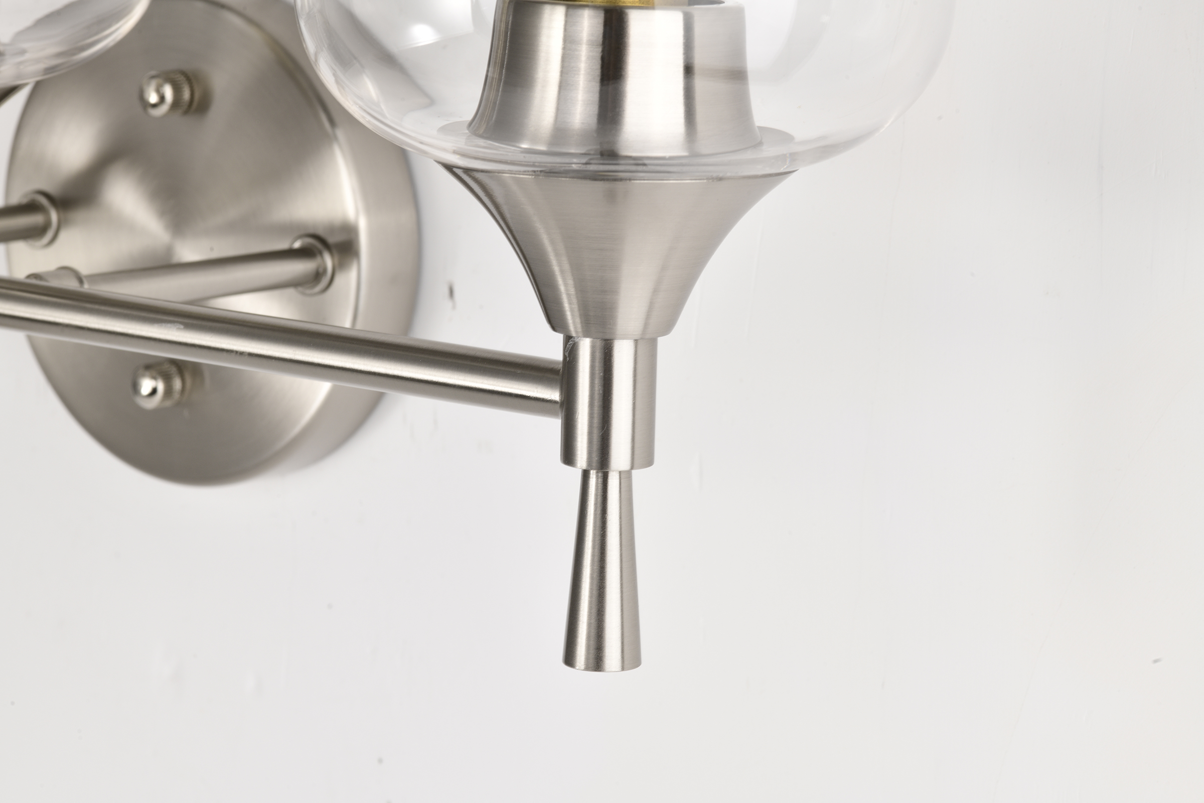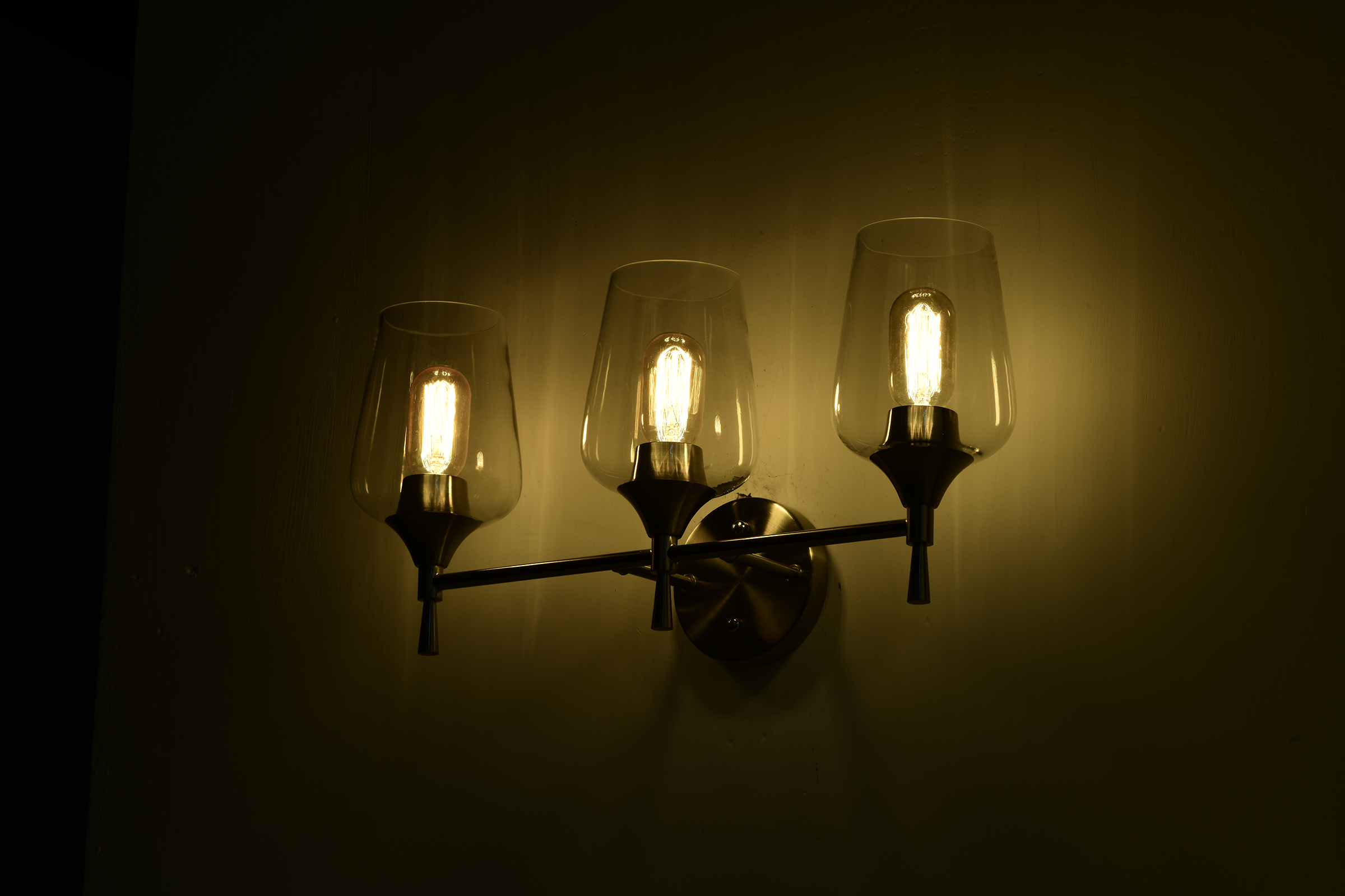 This 3 light fixture takes vanity lighting to a whole new level with its clean lines and fine details. The shiny brushed nickel finish complements the clear wine glass shades while illuminating the home with its 3 medium base bulbs (not included). Place this light above your bathroom mirror to complement the rest of your décor. We recommend adding a dimmer switch with dimmable bulbs to set the mood accordingly.