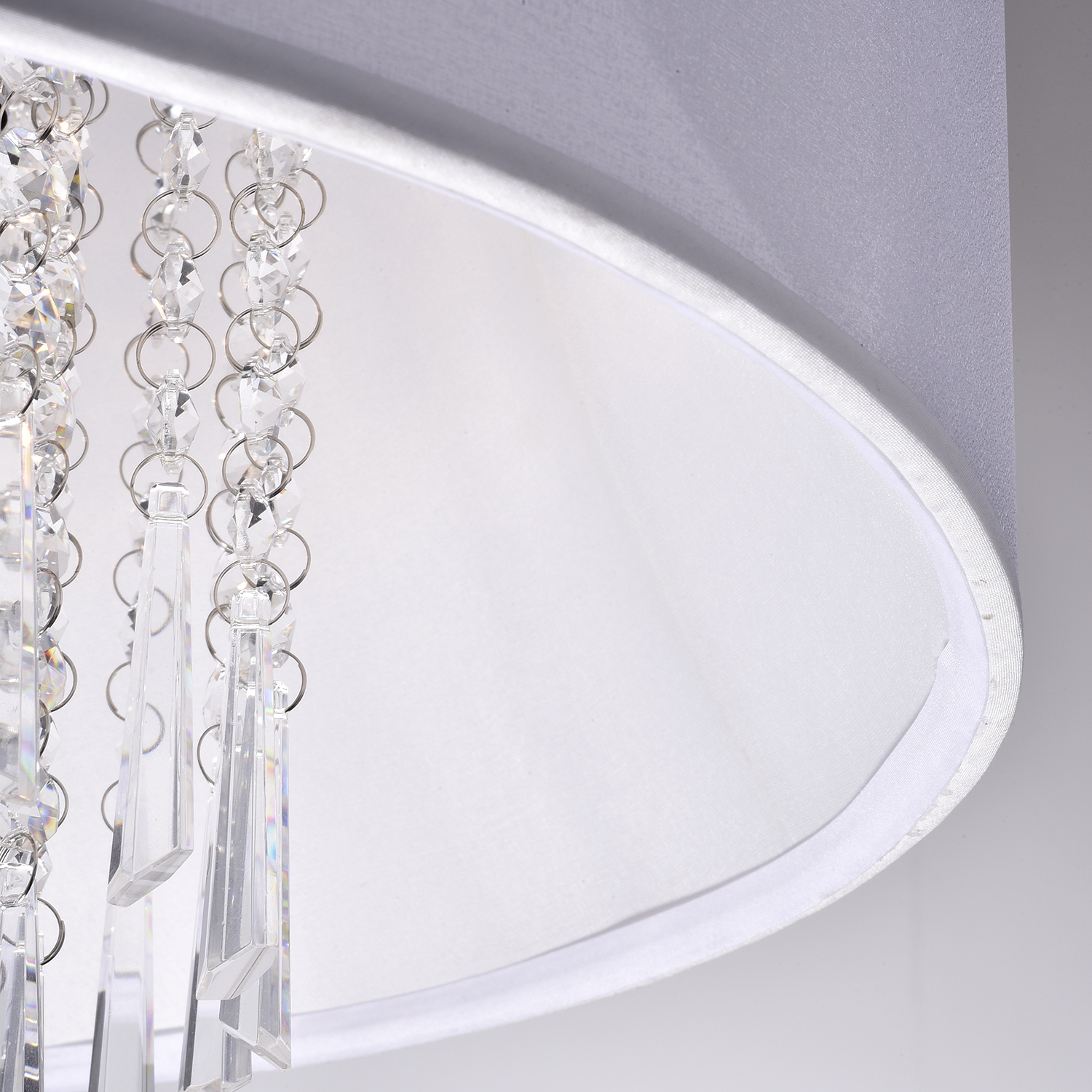 - Chrome finish white drum shade chandelier with clear crystal decoration