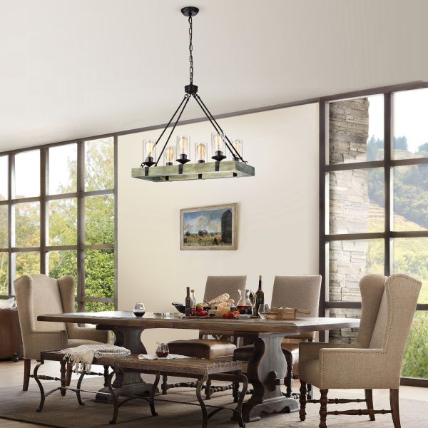 This rustic farmhouse light combines wood and wrought iron to grace your design. The contrast in the textures makes it a perfect combination for today’s trends. Six black candle sleeve are covered by clear glass shades. the 48-inch chain is adjustable and we always recommend adding a dimmer switch for even more customization.