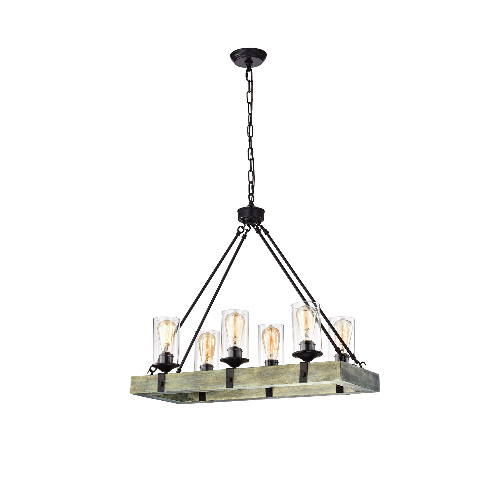 6-Light Matte Black and Vintage Wood Farmhouse Linear Chandelier Clear Glass