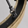 - Black and wood wheel chandelier with clear glass shade sconces.