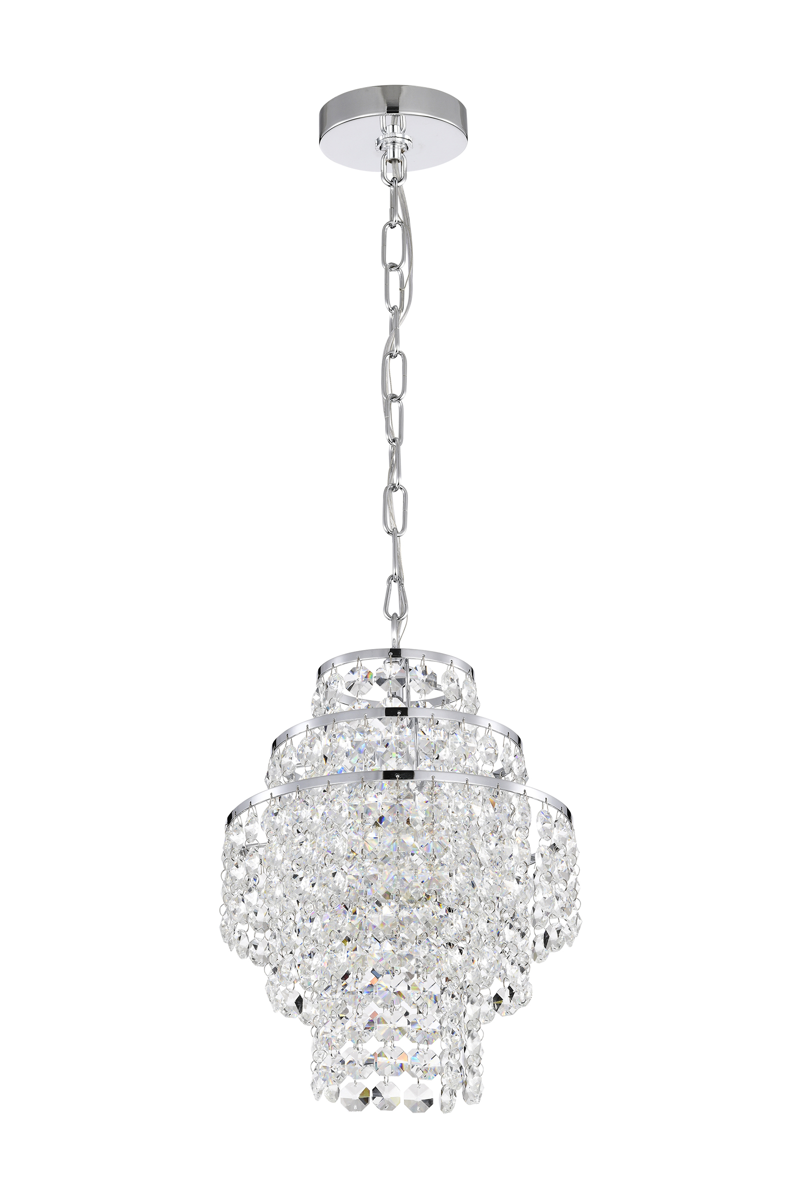 The Arietta 1 light mini chandelier has all the marvelous qualities of a grand crystal chandelier without taking up too much space. A nest of three rings with hanging crystal strands creates a beautiful tiered cascading design. Beneath the multi-faceted clear glass crystals, one E26 base bulb (not included) shines through. Place this light on its own or in multiples above the kitchen island, breakfast nook, or dining room as a source of light and home accent. The chrome finish of this mini chandelier is made to complement a variety of home interiors. Hanging from an adjustable 40 inch chain, this light is also compatible with a dimmer switch and dimmable bulbs.
