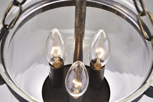 Bell shape blends with contemporary appeal in this glass lantern pendant chandelier that features an iron base and a clear glass shade. This gold-brushed black antique bronze medieval style chandelier features a three-light design that will illuminate and glow in any room This semi-flush mount chandelier would be great for an entryway or smaller space. Easy to clean and assemble. The finish is a gold-brushed black antique bronze.