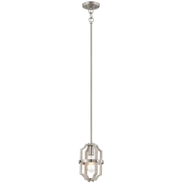 The 7.5 in. mini pendant features a rustic modern look with its white washed wood finish. The corner-curved open cage structure, and the blend of white washed wood tones as well as brushed nickel metal details, create a style that is perfect with rustic and modern decor, ideal for illuminating coastal, farmhouse, traditional, transitional, modern, craftsman, and bohemian interiors. A remarkable addition to your hall way or foyer, or suspended above your kitchen island, breakfast bar, or table of any kind.