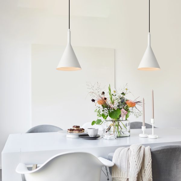 This 1-light pendant is the perfect source of illumination above the kitchen with its cone-shaped silhouette and downward light direction. Its metal construction and white finish give this pendant light a modern touch while boasting a classic shape. The sleek cord hanging method adds to the overall design of this modern pendant light while be adjustable to suit a variety of ceiling heights. On its own or in multiples, this single pendant light will grace the kitchen island, dining room, or breakfast room with contemporary style.