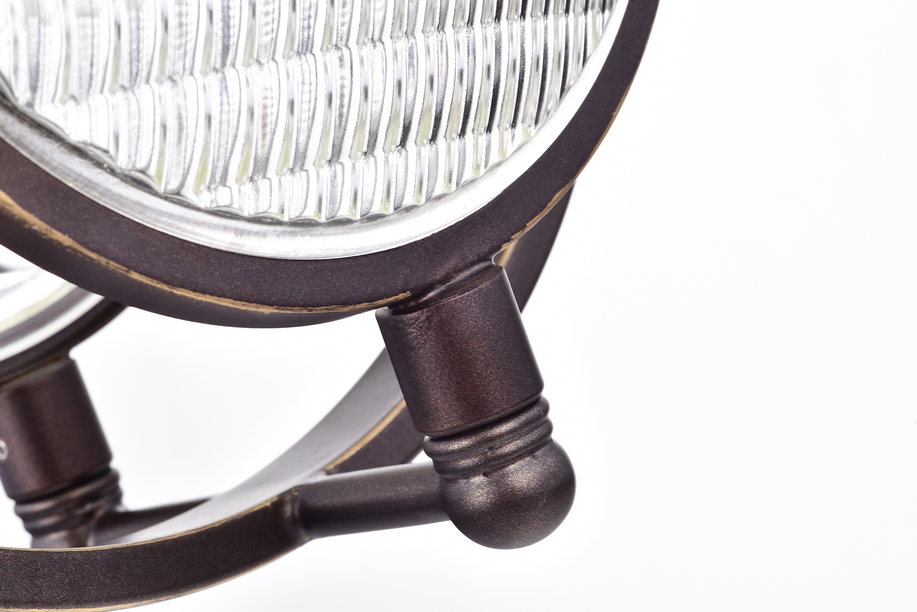 The authentic automobile headlight glass in this modern pendant makes this piece bold and dramatic, perfect for kitchens and man caves. Modern blends with industrial as the light shines through the textured round glass. The oil rubbed bronze hardware finish off this piece and make it a conversation starter.