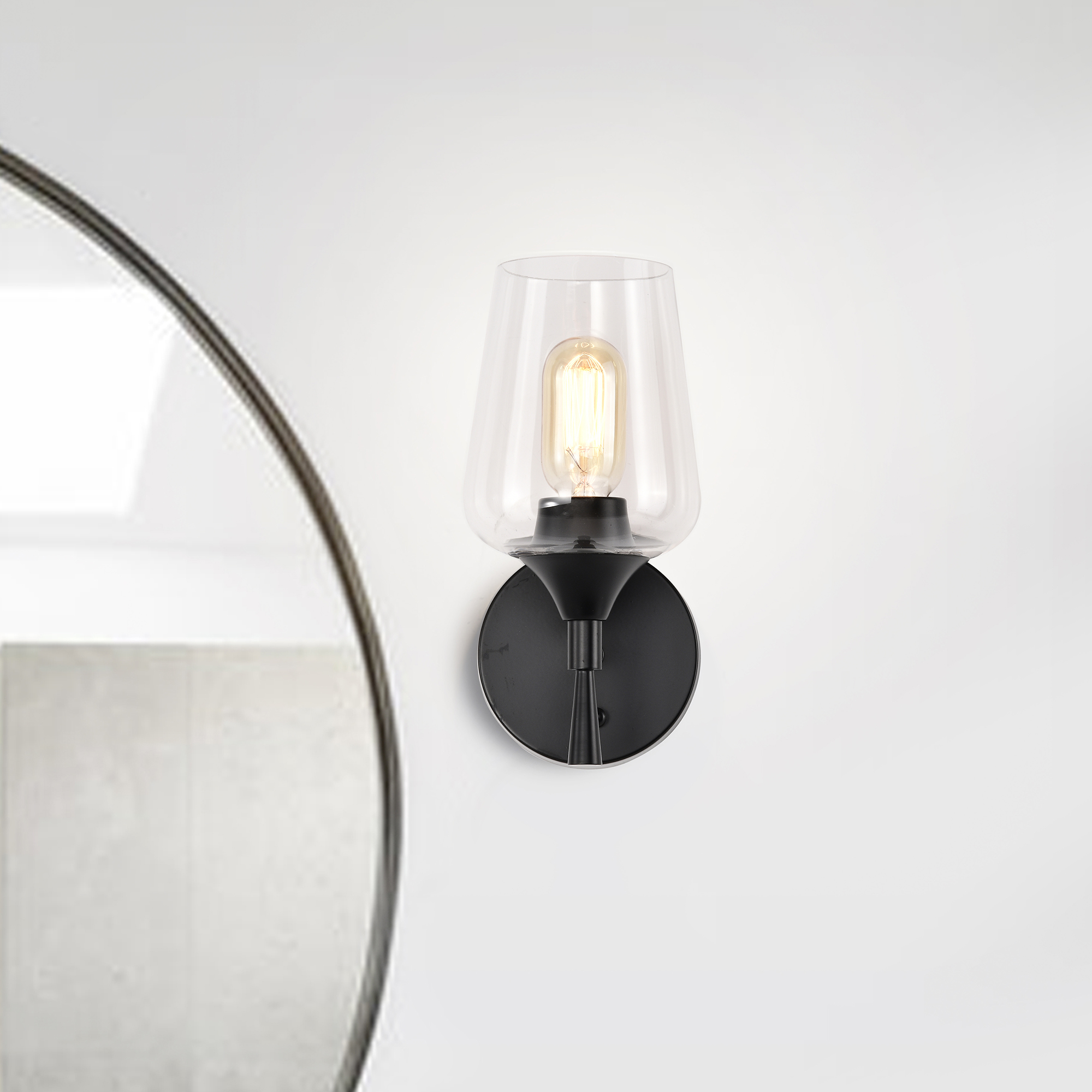 Embrace minimalism with this 1 light contemporary wall sconce. The elegant clear wine glass shade perfectly contrasts the finely crafted matte black finish tapered stem and round wall plate. Pair this wall sconce on either side of the bathroom mirror as vanity lighting or use it to accent your hallway, living room, or bedroom. We recommend adding a dimmer switch and dimmable bulbs to set the mood accordingly.