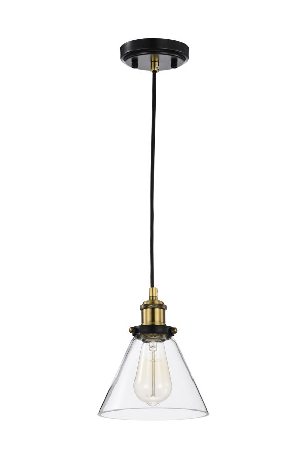 • Black and Antique Brass Modern Farmhouse Pendant Fixture with Clear Glass Cone Shade