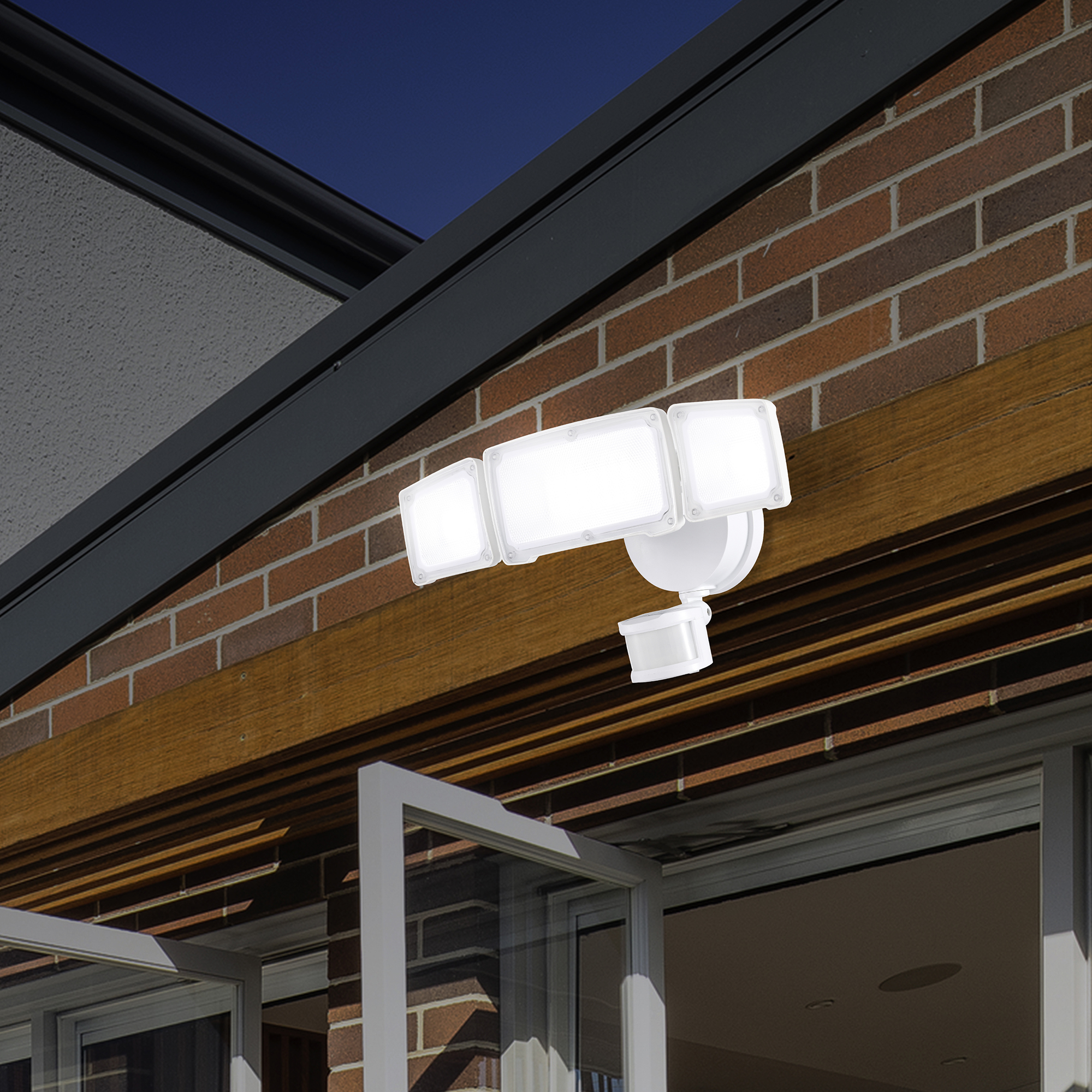 - The LED outdoor security light features an adjustable 3 head design that allows you to customize the angle of each head at any direction. This design allows you to get more use out of just one security light fixture by pointing the heads in three different directions to ensure you are meeting your security light coverage needs. The motion sensor is also adjustable with a detection range from 29-70ft.